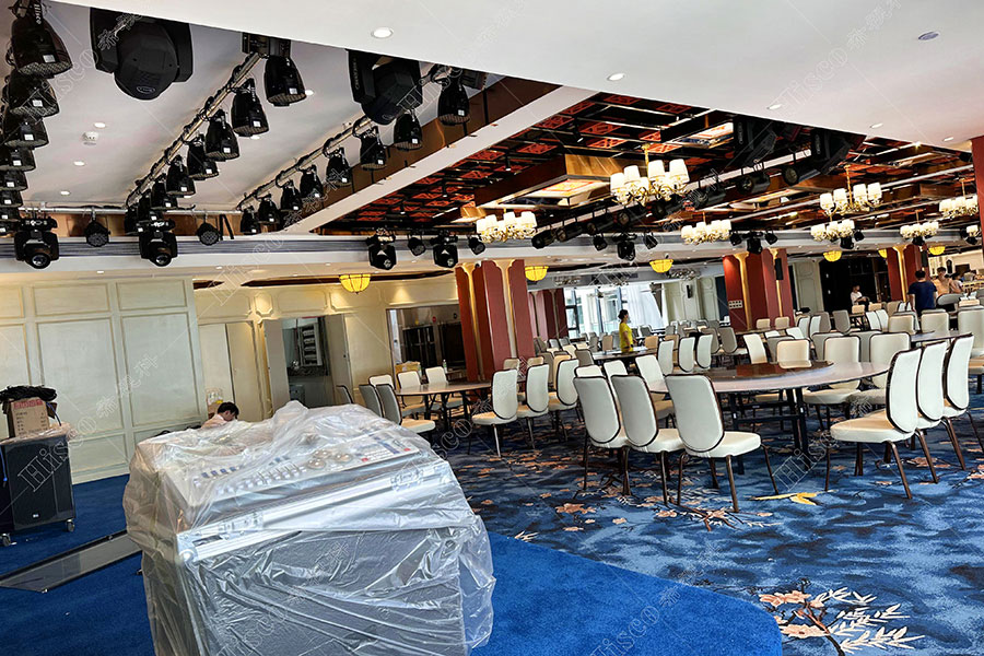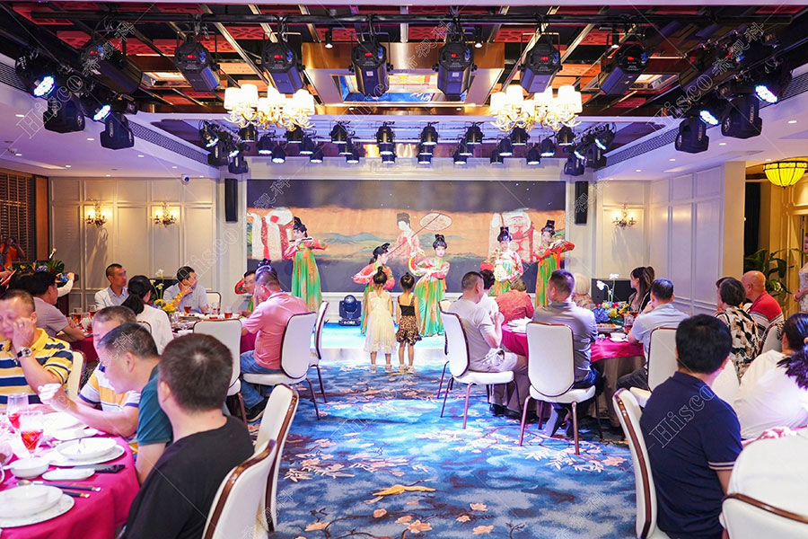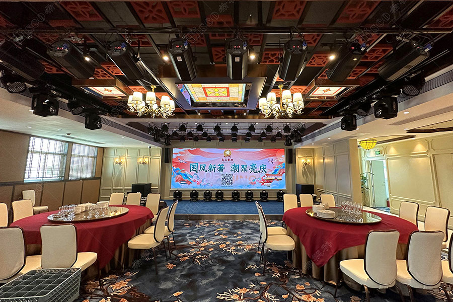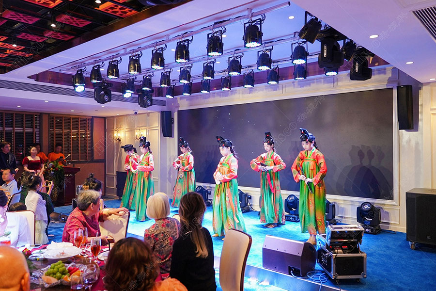 本次宴会厅设计采用数字会议系统,扩声系统、显示系统、集中控制系统、矩阵系统、舞台灯光系统等,演出时采用左右立体声空间成像模式,直达声与辅助音箱的效果声相结合表演,传达表演意境,使得演员和观众之间产生一种无声的交流。
